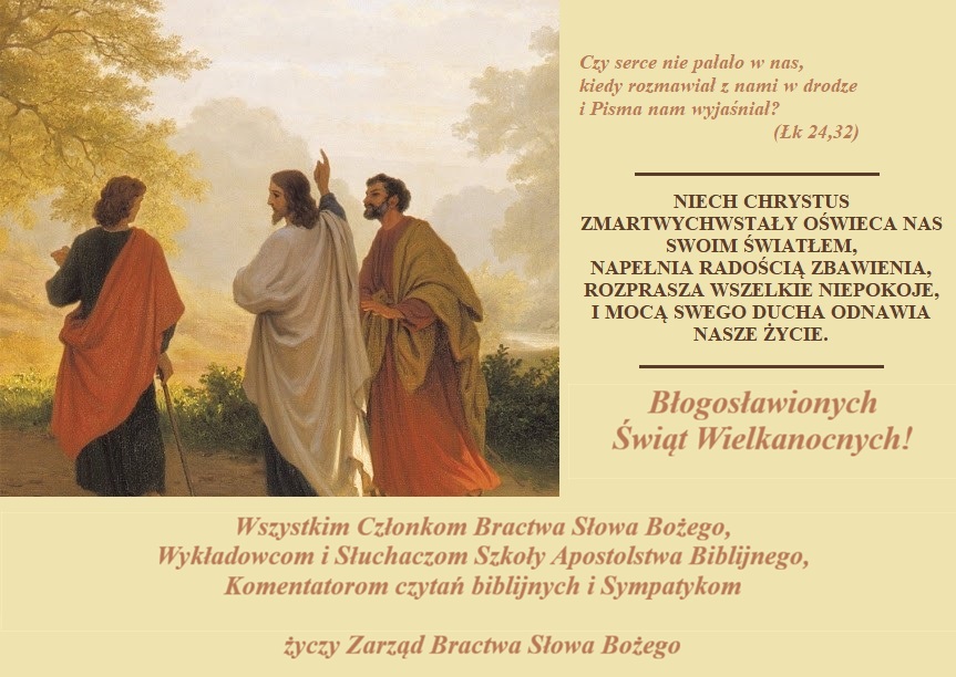 Wszystkim Członkom Bractwa Słowa Bożego, Wykładowcom i Słuchaczom Szkoły Apostolstwa Biblijnego, Komentatorom czytań biblijnych i Sympatykom życzy Zarząd Bractwa Słowa Bożego.
